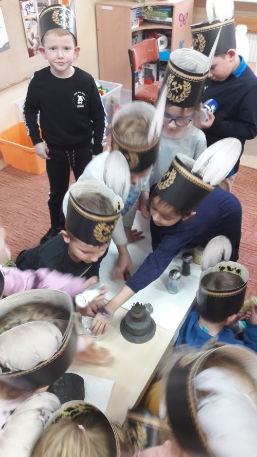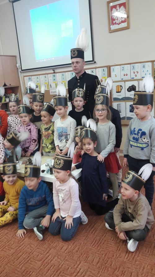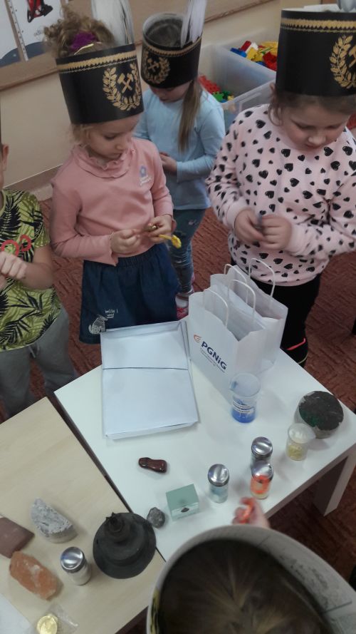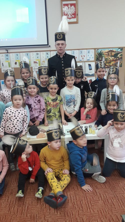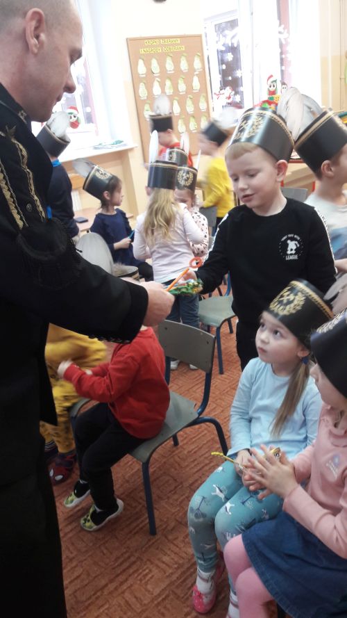 Dzieci wspólnie przeliczały guziki znajdujące się w mundurze , których jest 29- dokładnie tyle , ile lat żyła św. Barbara. Pan Łukasz opowiedział zebranym o swojej odpowiedzialnej i ważnej pracy. Pokazał wychowankom próbki zawierające różne kopaliny: węgiel, siarkę, sól, wapń, złoto. Dzieci otrzymały czapkę –czako, pamiątkowe ołówki , żelki i kolorowanki. Spotkanie upłynęło w miłej i serdecznej atmosferze. Przedszkolaki chętnie pozowały do pamiątkowych zdjęć z wyjątkowym gościem. Podziękowały panu Łukaszowi za przybycie i zaprosiły na następny rok.