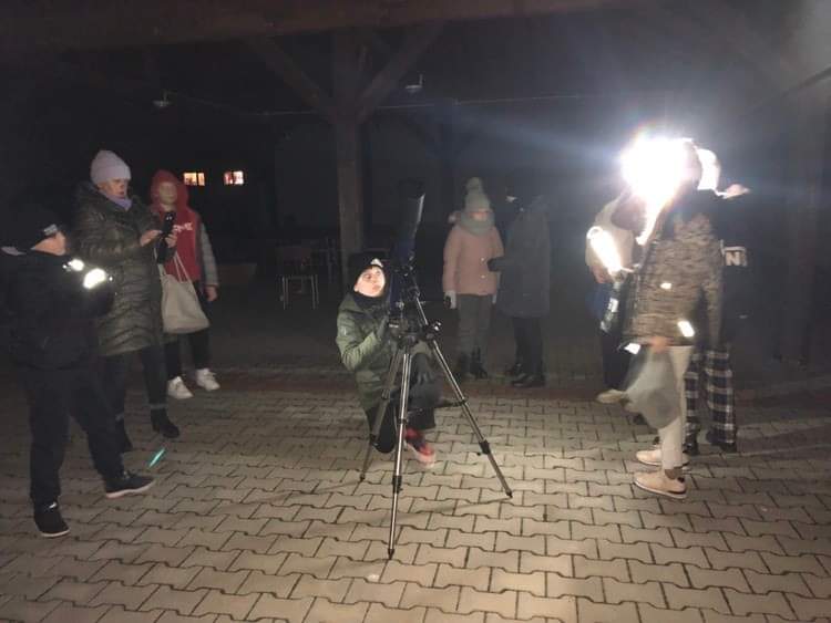 Obserwacje nieba należą do niezwykle ciekawych i – co najważniejsze – lubianych przez młodzież zajęć. Pierwsze, amatorskie obserwacje nieba prowadzimy zwykle prostymi metodami i przy użyciu prostych przyrządów. Gwiazdy, które układają się w gwiazdozbiory najlepiej obserwuje się „nieuzbrojonym okiem”. Nasze oczy to „lornetka”, za pomocą której można dostrzec całe mnóstwo ciekawych zjawisk i obiektów na nieboskłonie. Mając to na uwadze, 15 lutego 2023 r., wieczorem, uczniowie pod opieką nauczycielki p. A. Chmieleckiej i wychowawczyni klasy p. A. Kalka, udali się na plac przy sali wiejskiej w Granowcu. Z dala od świateł szukali na niebie, poznane wcześniej na zajęciach gwiazdozbiory oraz obiekty, np.: gwiazdozbiór Oriona, Wielką i Małą Niedźwiedzicę, Trójkąt Zimowy, Gwiazdę Polarną, Saturna….