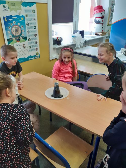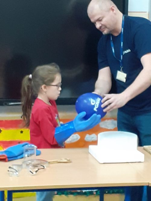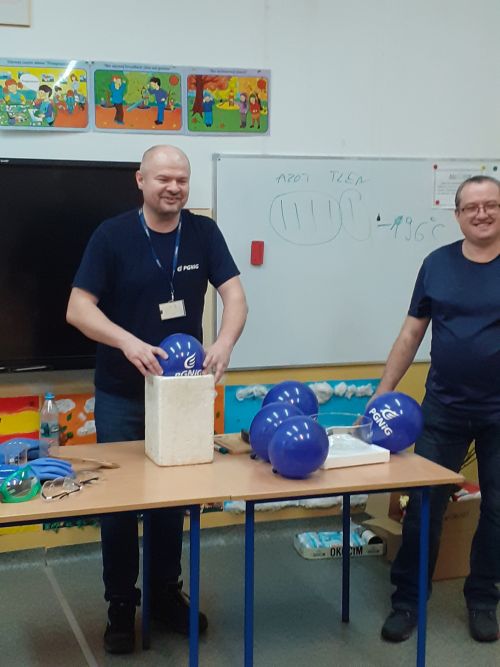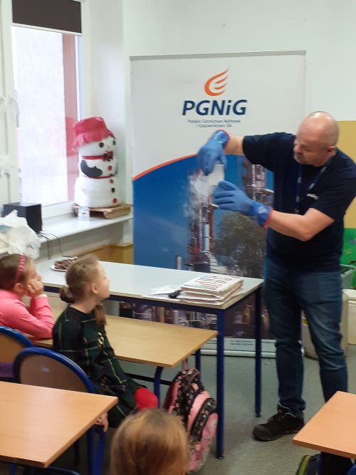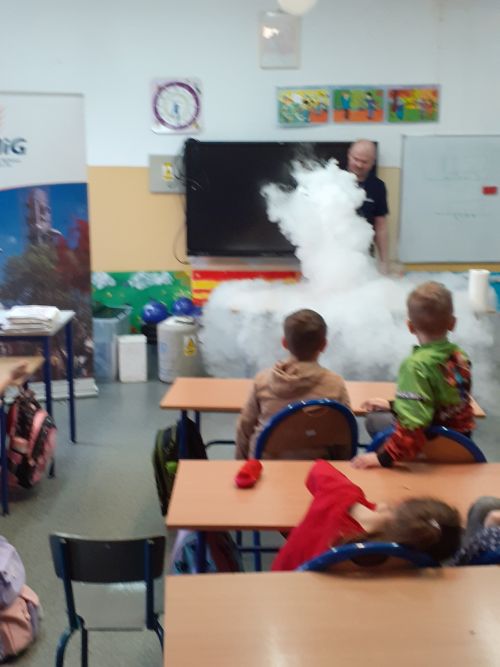 Uczniowie klas I- III wzięli udział w pełnej eksperymentów i doświadczeń lekcji pokazowej. Lekcja odbyła się w ramach serii zajęć organizowanych przez PGNiG w Odolanowie wykorzystując ciekły azot.