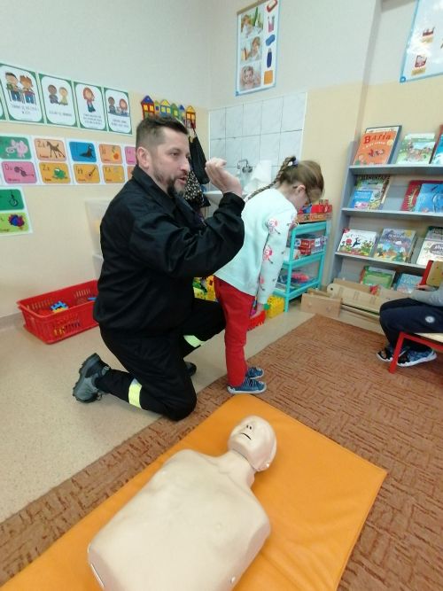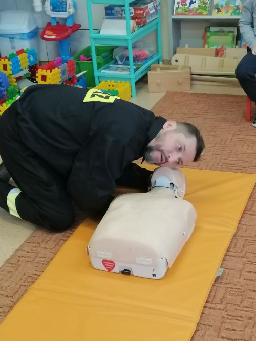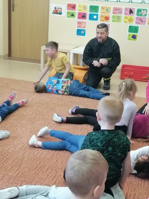 Celem spotkania było przygotowanie przedszkolaków do wykonywania prostych czynności z zakresu udzielania pierwszej pomocy oraz prawidłowego zachowania się w sytuacjach zagrożenia życia lub zdrowia. Dzieci dowiedziały się , co należy robić w przypadku zadrapania, skaleczenia lub złamania nogi. Uczyły się, jak należy sprawdzać przytomność osoby poszkodowanej i w jaki sposób można komuś pomóc zanim przyjedzie pogotowie ratunkowe. Poznały podstawowe zabiegi resuscytacyjne, ćwicząc na fantomie, oczywiście na miarę swoich możliwości . Ponadto przedszkolaki układały poszkodowanego w pozycji ustalonej bocznej . Pan Radek pochwalił dzieci za aktywność, wiedzę i umiejętności. Na zakończenie wizyty, gość ofiarował dzieciom książki Cecylki Knedelek „Pierwsza pomoc nie tylko dla przedszkolaków ” , zaś dzieci podziękowały Naczelnikowi za pouczające spotkanie.