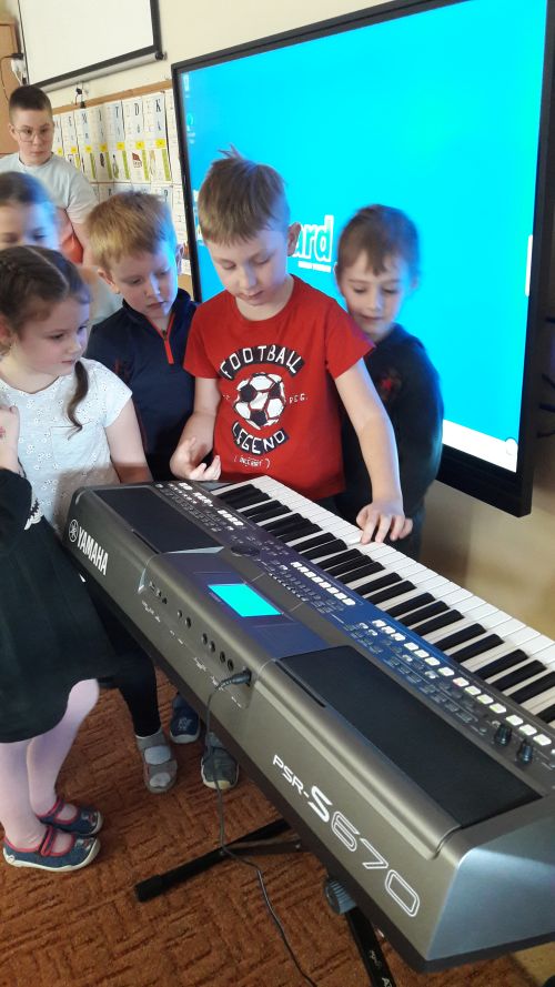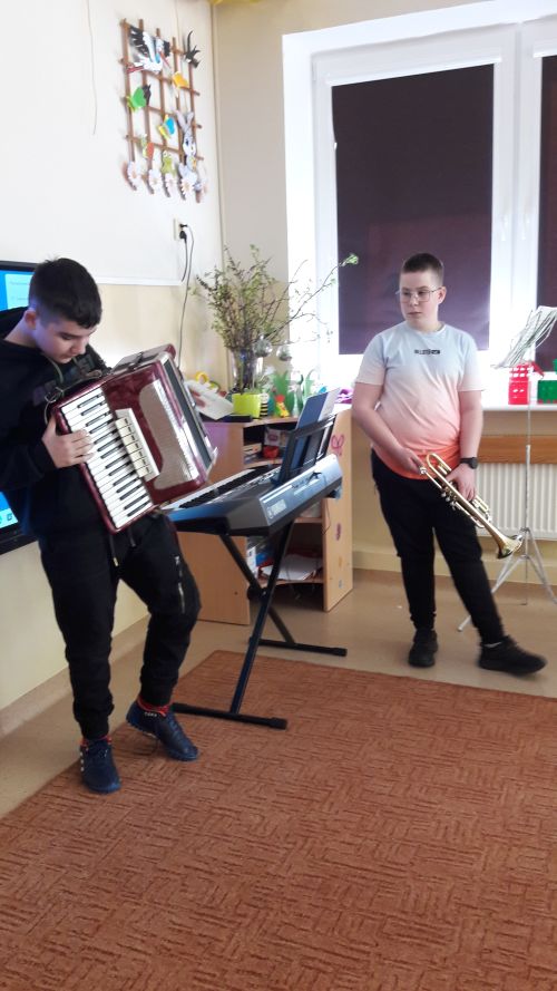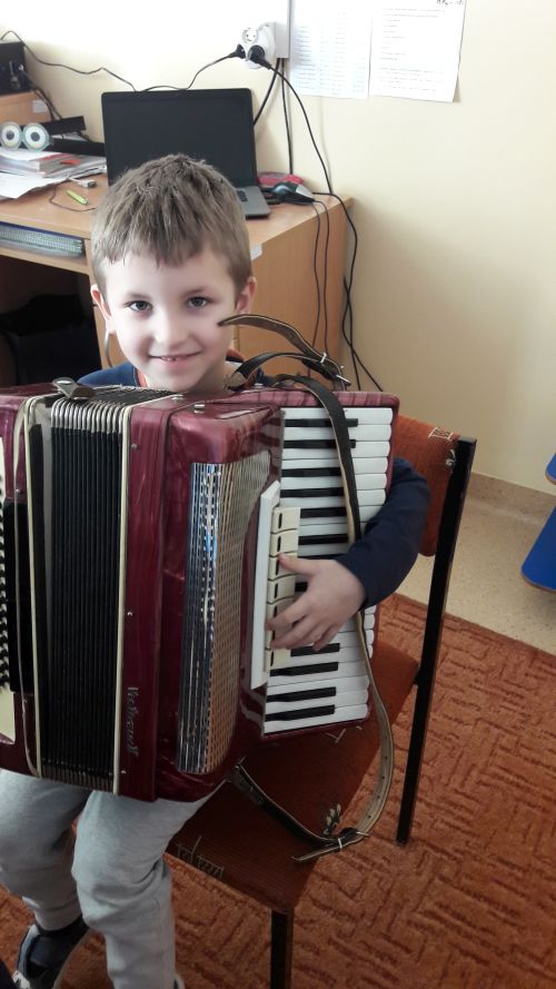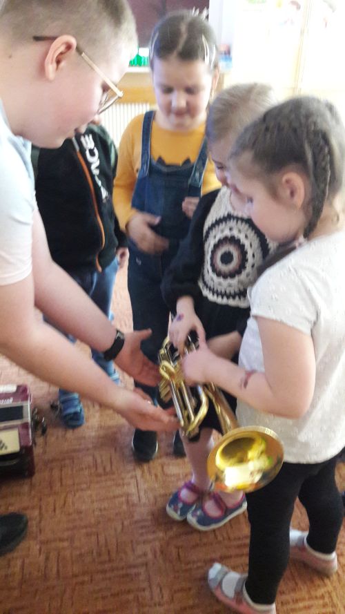 W czwartek przedszkolaki gościły muzykujących kolegów z ósmej klasy: Nikodema Kuświka oraz Piotra Pudysa. Chłopcy zaprezentowali dzieciom swoje instrumenty: trąbkę, akordeon oraz keyboard.