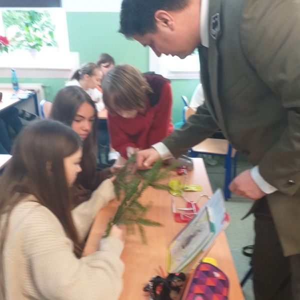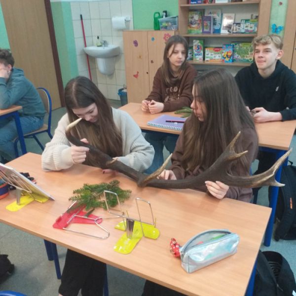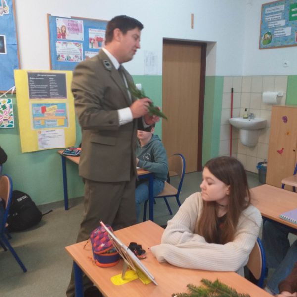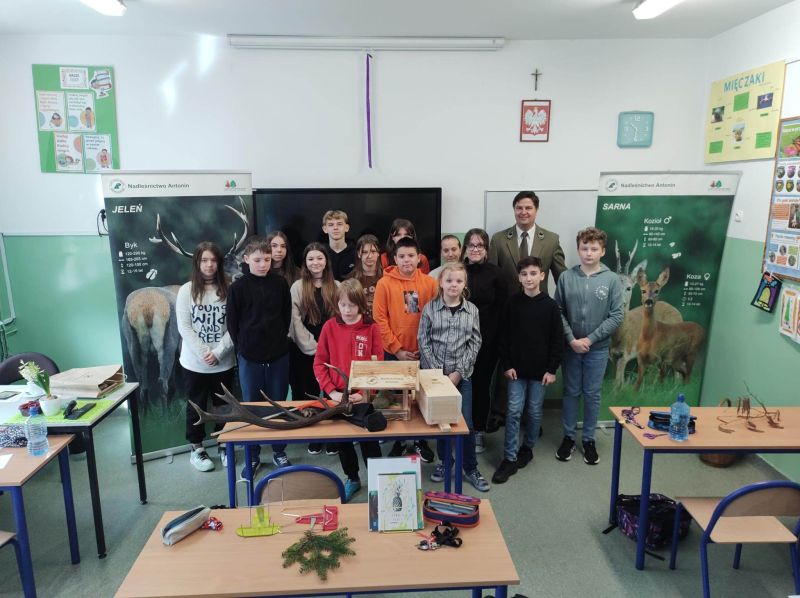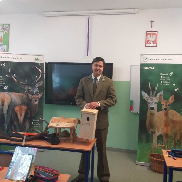 Pierwszego dnia wiosny klasę VI odwiedził pan Michał Duszyński, leśniczy z Nadleśnictwa Antonin. Pan Michał wyjaśnił czym zajmuje się na co dzień i na czym polega jego praca.