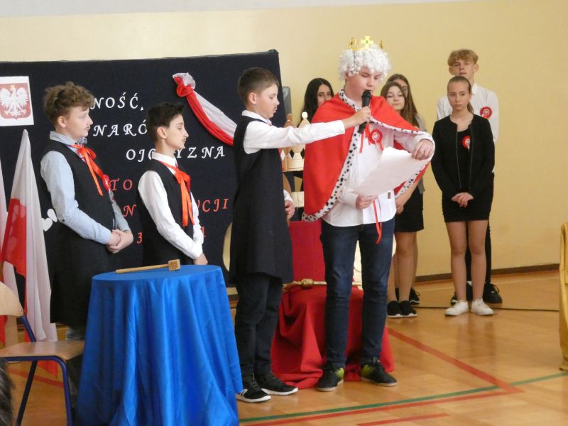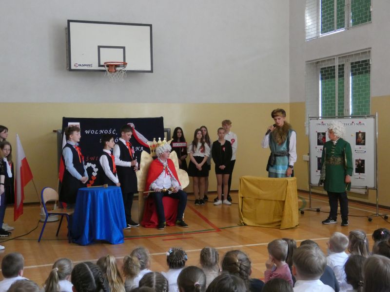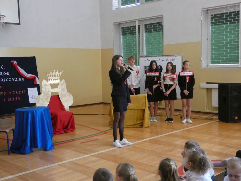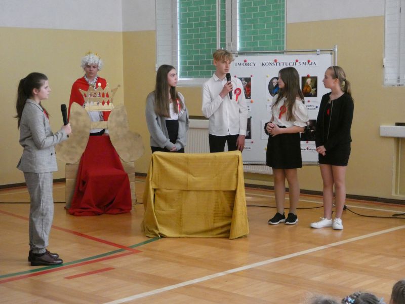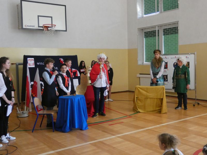 Występujący uczniowie odegrali krótkie scenki. Podczas sejmiku uczniowskiego przybliżyli historię powstania majowej Konstytucji, jej główne założenia oraz twórców. Wcielając się w role króla Stanisława Augusta Poniatowskiego, Marszałka Sejmu oraz ówczesnych posłów, młodzi aktorzy przypomnieli, co zdarzyło się 3 maja 1791 roku. Był to dzień wolności i radości. Słowa recytowanych wierszy oraz hasła: Wolność, Naród, Ojczyzna podkreśliły, jak ważne było to dla Polski wydarzenie.