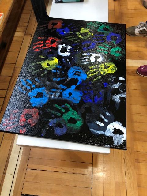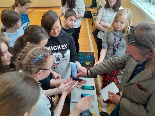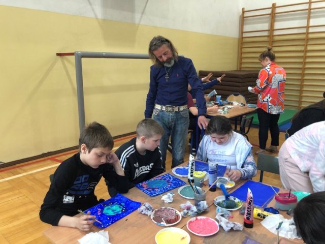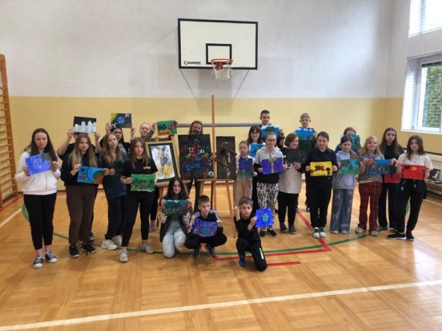 Artysta najpierw pokazał uczniom kilka swoich prac, a następnie poprosił ich o uruchomienie swojej wyobraźni i stworzenie dzieła o tematyce ekologicznej. Zajęcia te sprawiły uczniom bardzo dużo frajdy i chętnie wykonywali oni swoje zadania, a ich arcydzieła ozdobią nasz szkolny korytarz. Na koniec pan Robert zaproponował wykonanie wspólnej pracy- odciśnięcie dłoni wszystkich uczestników warsztatów na pamiątkowym płótnie.
