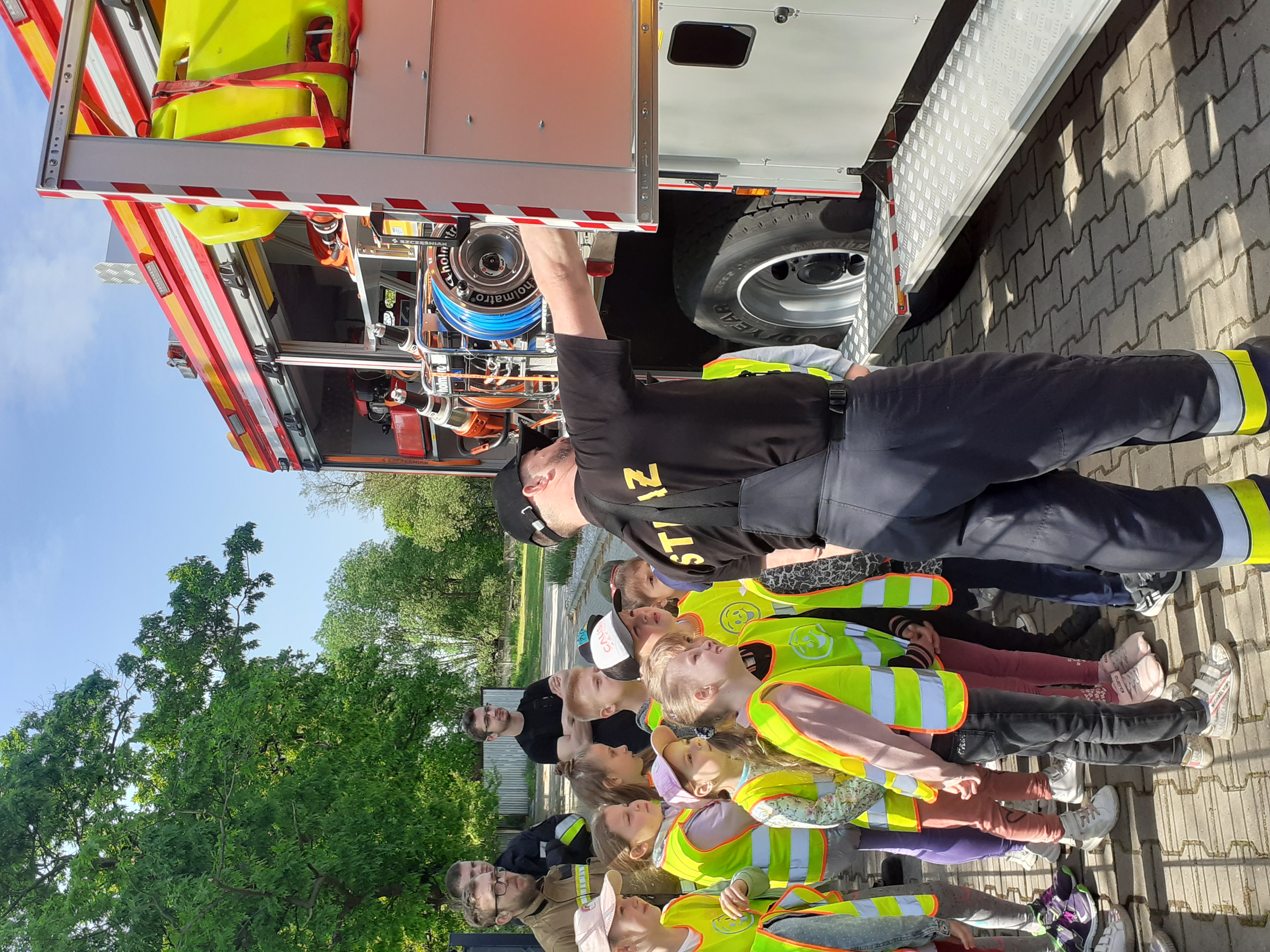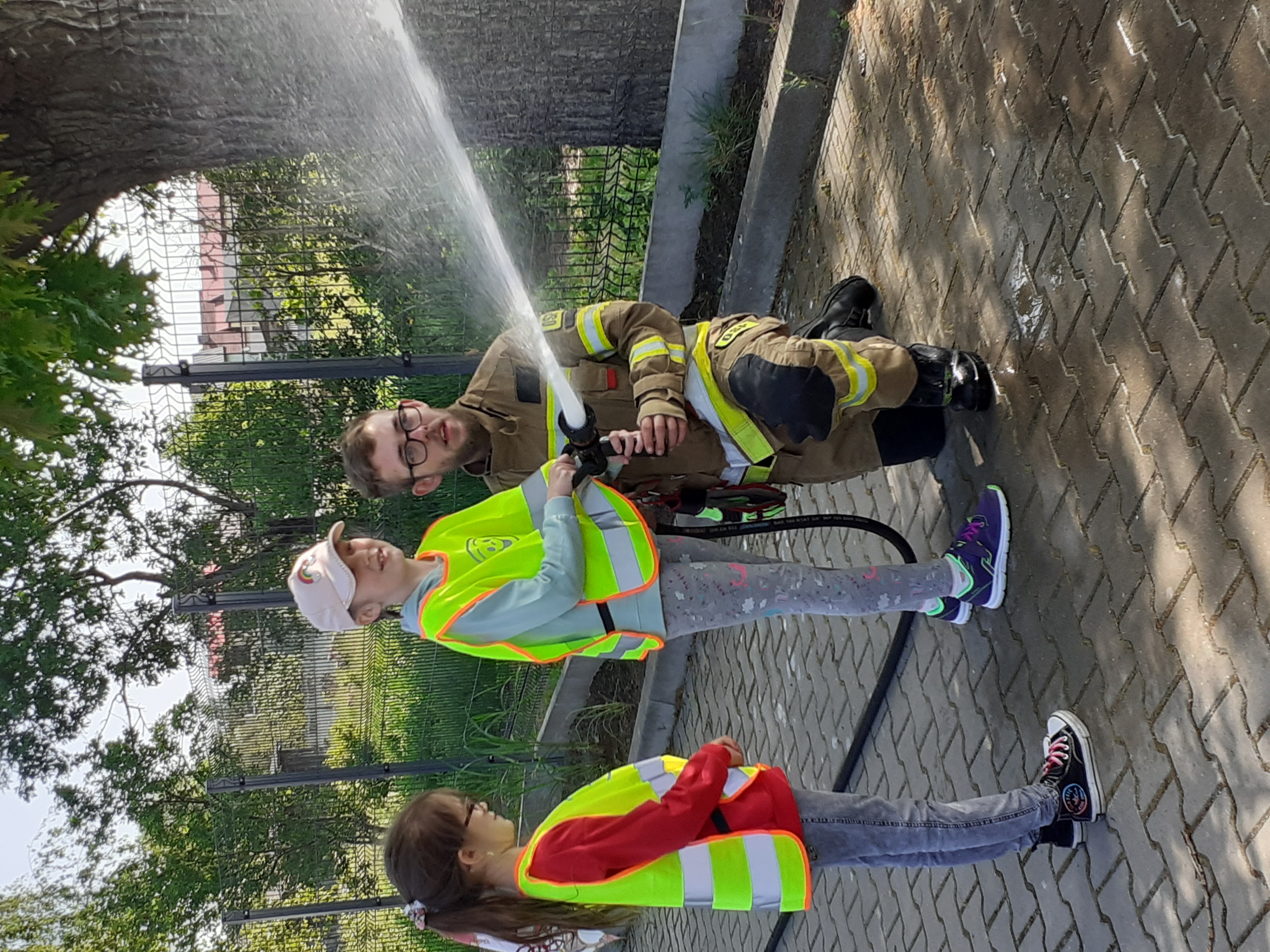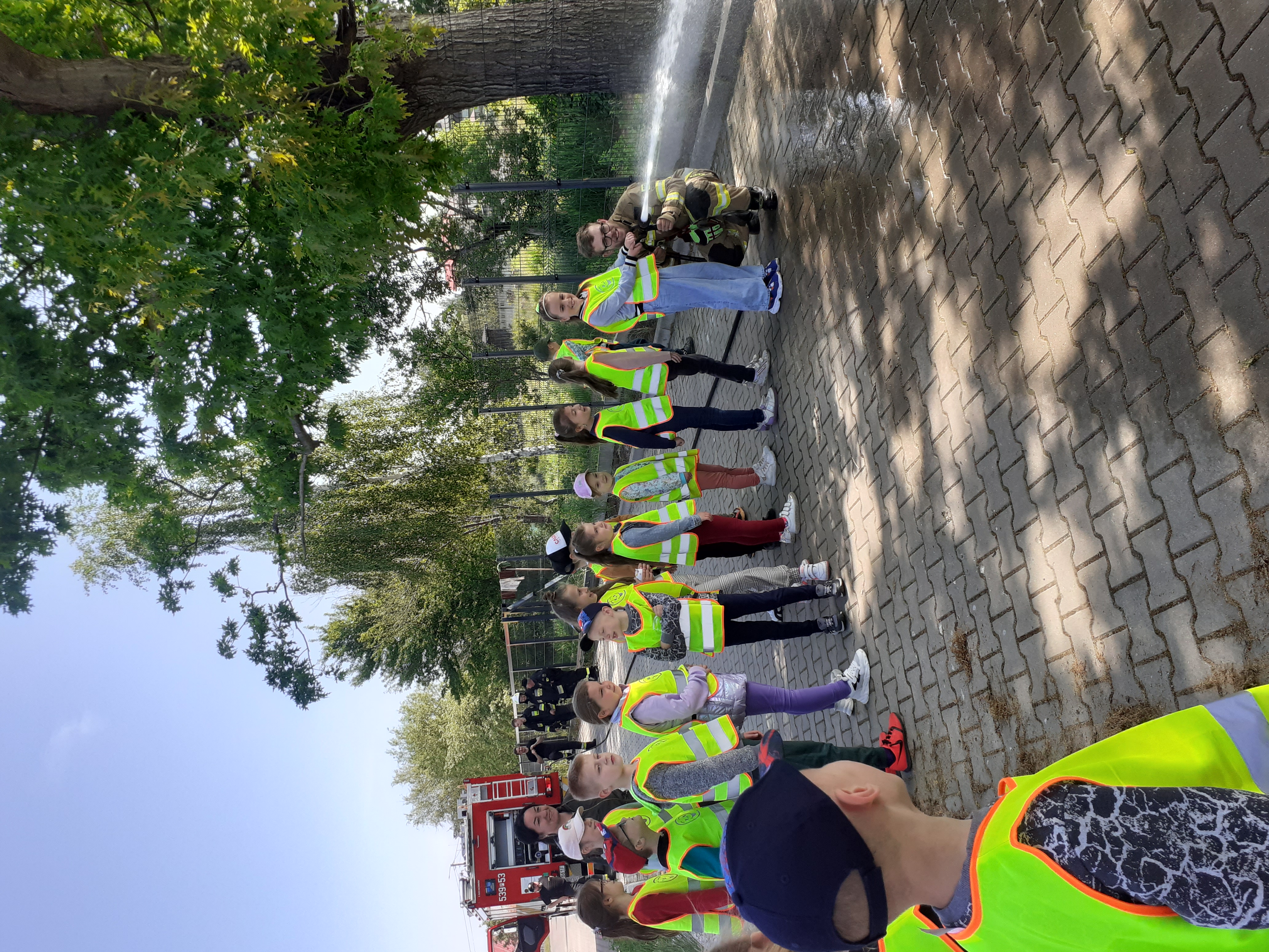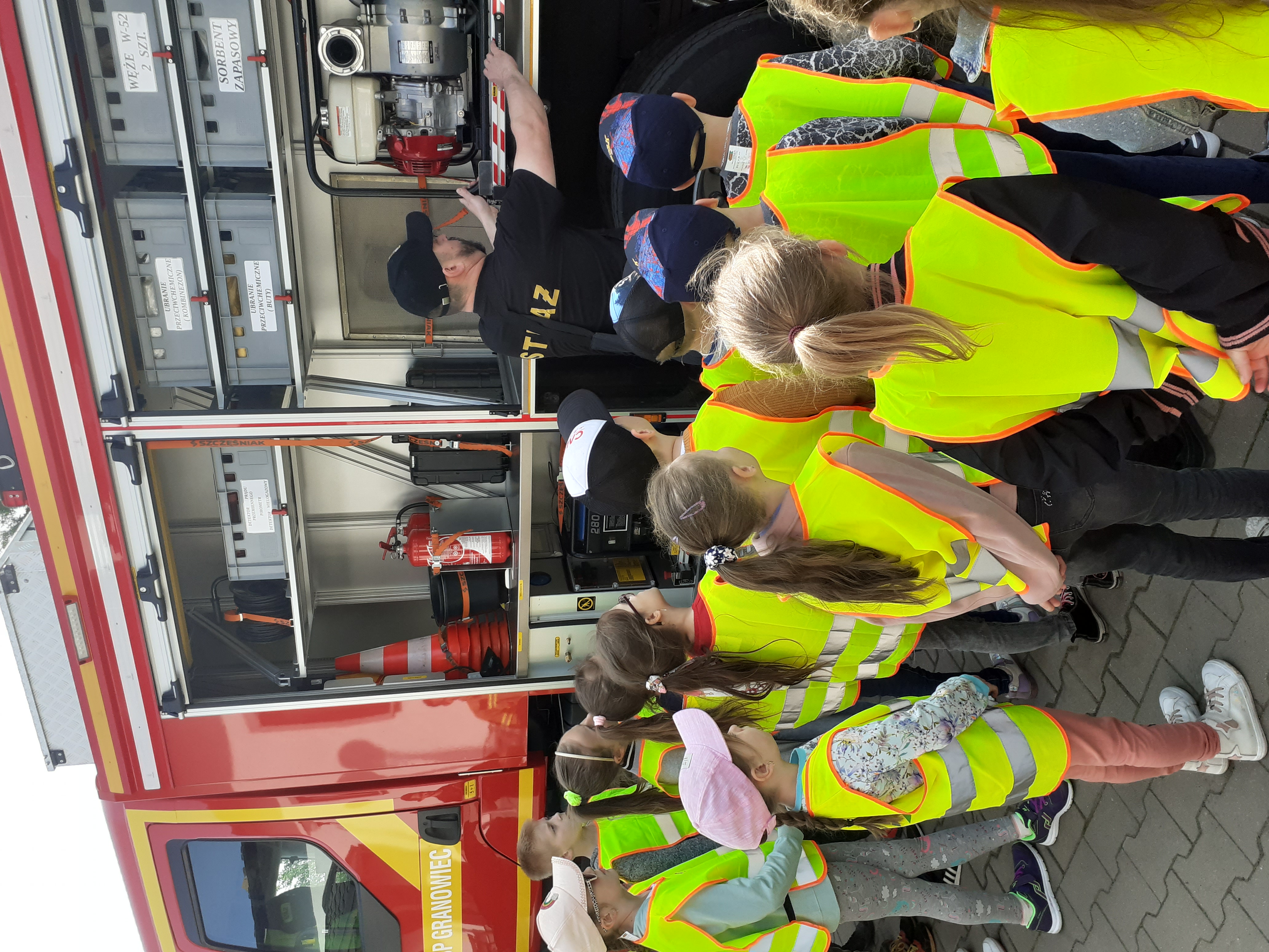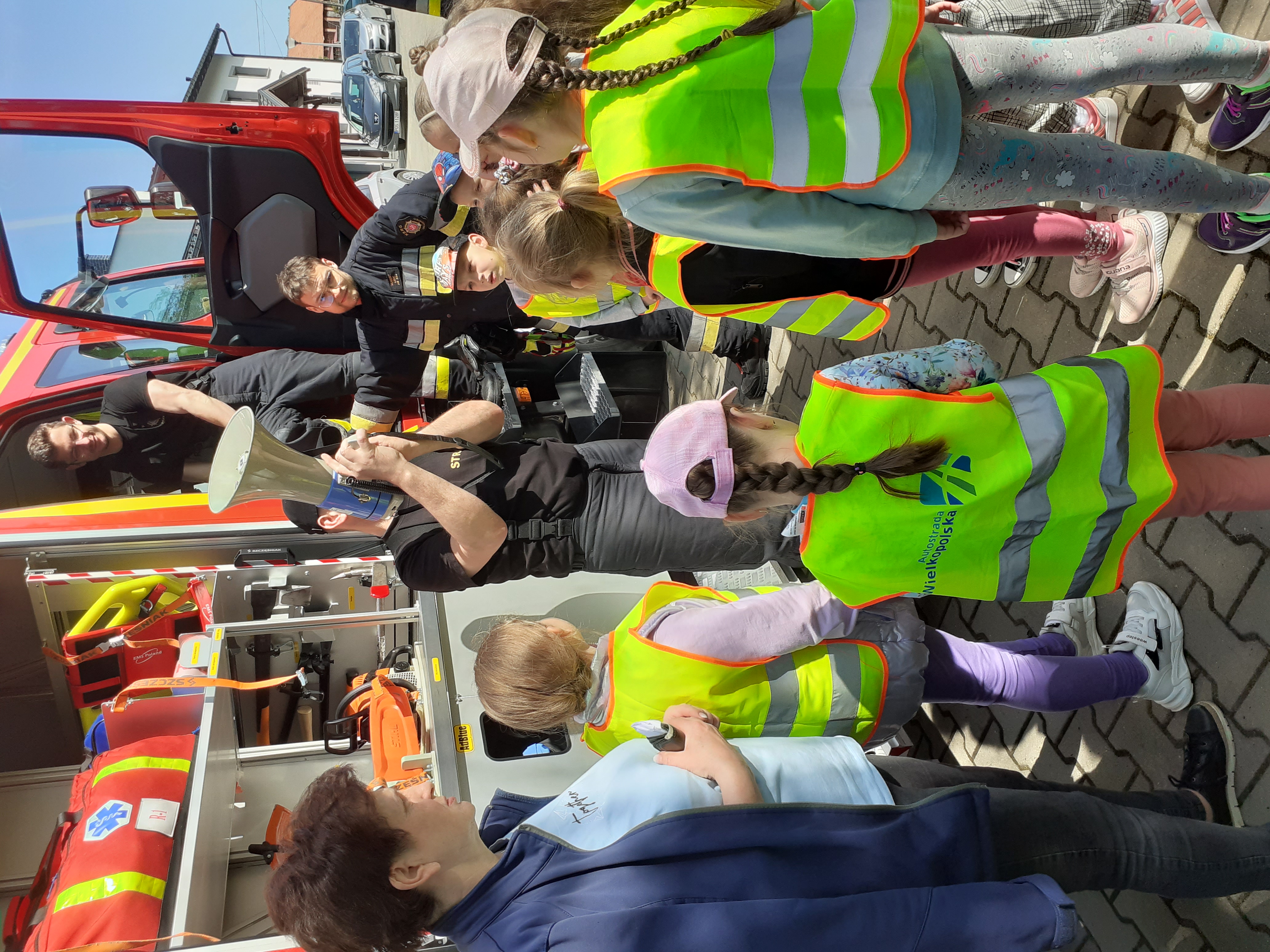 Dzieci dowiedziały się, że strażacy nie tylko gaszą pożary, ale również są wzywani do wypadków samochodowych, do zalanych domów, powalonych drzew, a także ratują zwierzęta. Podczas spotkania strażacy uświadomili dzieciom jak zachowywać się w sytuacjach zagrożenia, oraz jak powiadomić służby ratownicze i udzielać pierwszej pomocy. Wielką radość sprawiło uczniom obejrzenie z bliska wozu strażackiego oraz zapoznania się z jego wyposażeniem. Wszystkie dzieci mogły wypróbować swoich sił i zmierzyć się z prawdziwym wężem strażackim. Wychowankowie zwiedzili również remizę strażacką. Jednak największą atrakcją dla nich była przejażdżka wozem strażackim.