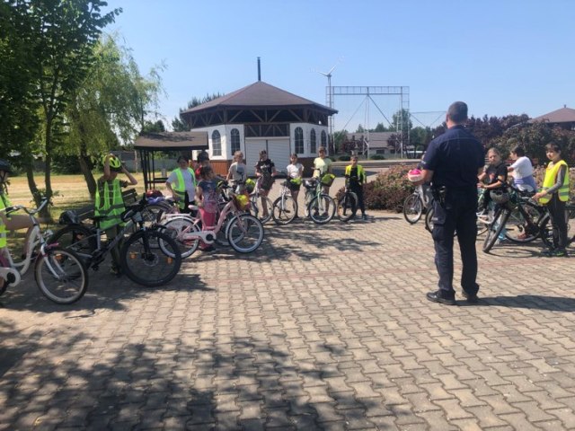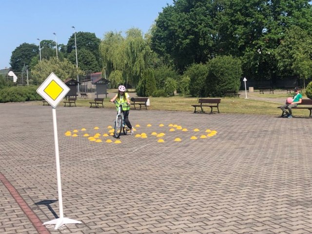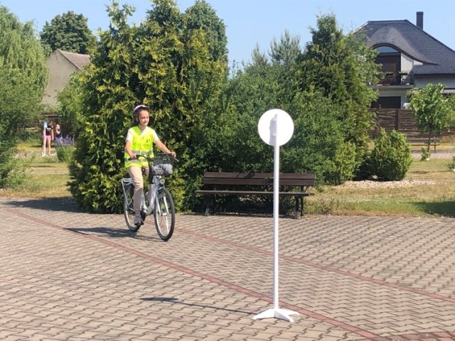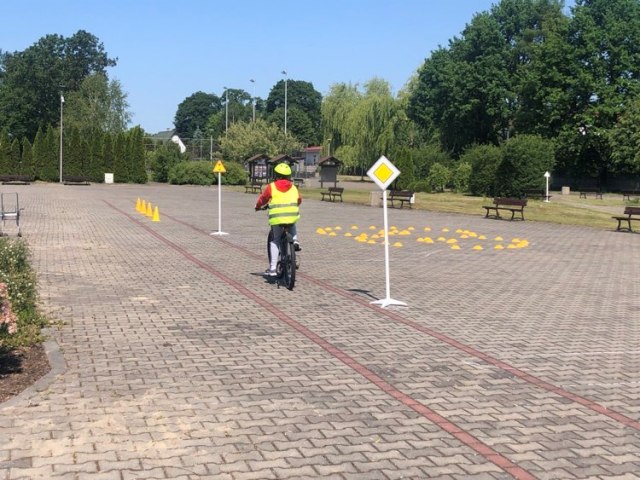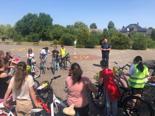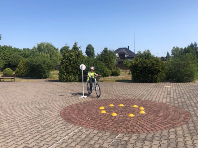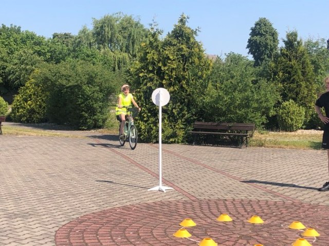 Nad bezpiecznym i sprawnym przeprowadzeniem egzaminu praktycznego czuwał Kierownik Posterunku Policji w Sośniach – asp. Damian Szewczyk. Uczniowie, poruszając się po specjalnie przygotowanym torze, musieli nie tylko stosować się do znaków i przepisów ruchu drogowego, ale również wykazać się sprawnością i opanowaniem sztuki jazdy na rowerze. Egzamin był okazją do rozmowy na temat zasad poruszania się po drogach rowerem i hulajnogą elektryczną. Pan Policjant przypomniał również dzieciom o podstawowych znakach drogowych, o prawidłowym wyposażeniu roweru oraz o potrzebie używania elementów odblaskowych i kasków ochronnych.