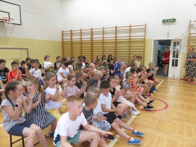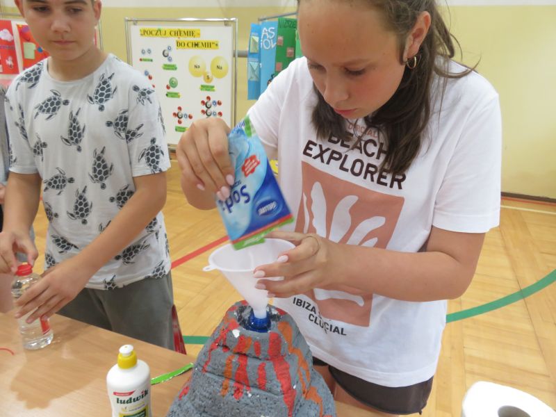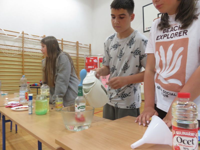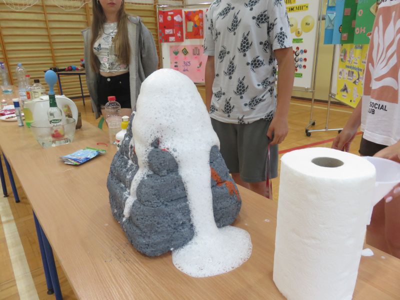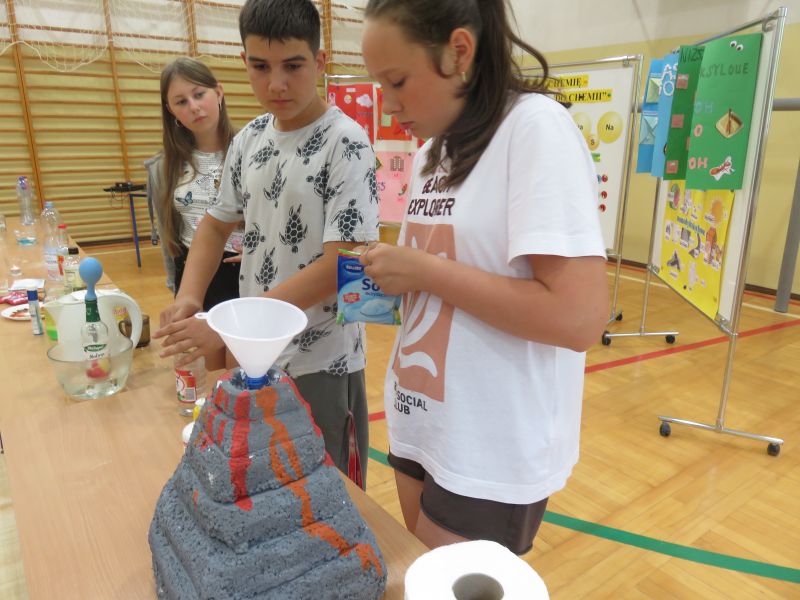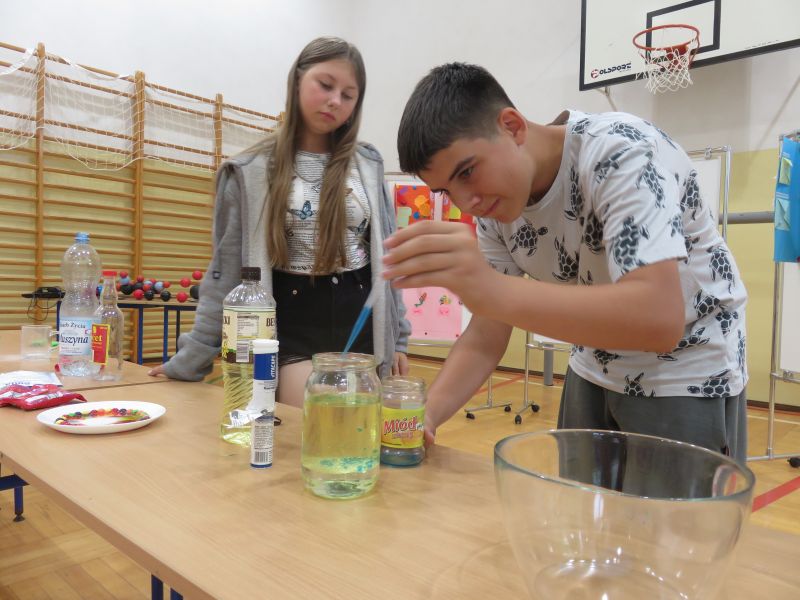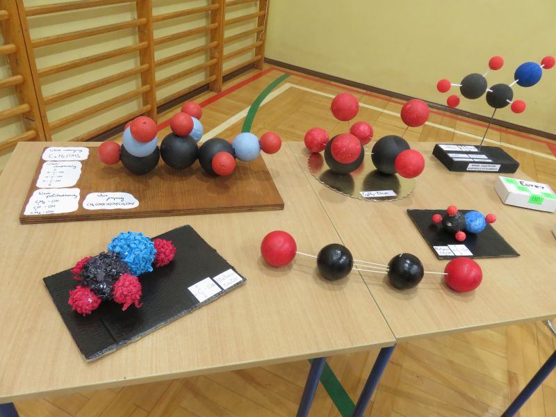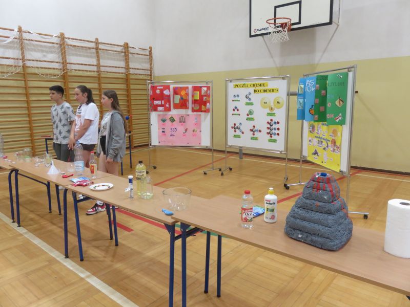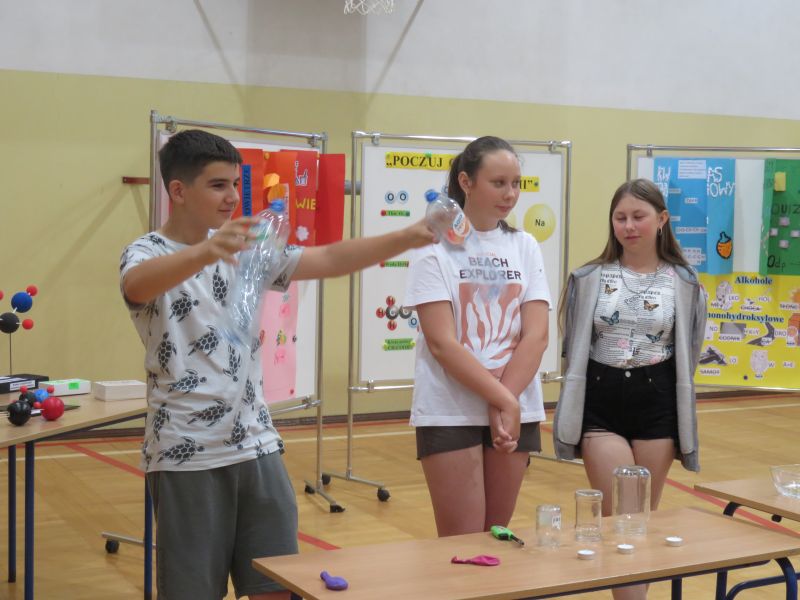 W sali gimnastycznej ósmoklasiści przygotowali wystawę prac, które były wynikiem podjętych przez nich działań. Uczniowie wykonali modele cząsteczek różnych związków chemicznych poznanych na lekcji, gry dydaktyczne, plakaty i lapbooki. Zorganizowali również dla młodszych kolegów i koleżanek pokaz doświadczeń chemicznych. Dzieci dowiedziały się wielu interesujących rzeczy, np. jak można nadmuchać balon bez pomocy ust. Z wielką uwagą i zainteresowaniem obserwowały pokaz eksperymentów oraz odpowiadały na pytania starszych kolegów. Było to dla nich ciekawe przeżycie. Na zakończenie chętni uczniowie uczestniczyli w quizie sprawdzającym podstawową wiedzę przyrodniczą.