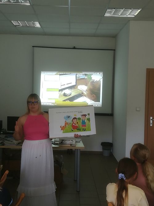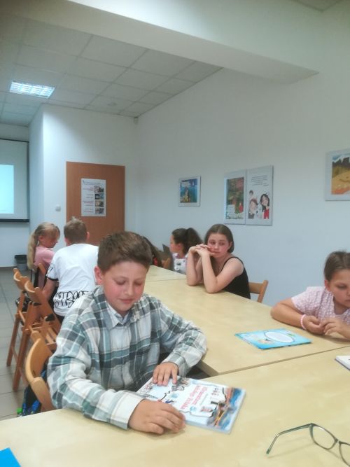 Pierwszym etapem wizyty były warsztaty. Pani Martyna, pracownik księgarni, przedstawiła uczniom prezentację pt. „Jak powstaje książka?”. Zapoznała ich z tajnikami „świata książki” i kolejnymi etapami jej powstawania. To dzięki niej uczniowie dowiedzieli się, kim jest autor i pisarz; czym zajmują się: redaktor, grafik, ilustrator, korektor tekstu; jak ułożony jest tekst w książce, jak zbudowana jest jej okładka i w jakich formatach może występować. Poznali również takie pojęcia jak: paginacja, tytulatura, gilotyna, wydawnictwo, ozdobna ramka, projekt, numer ISBN. Uważne słuchanie i oglądanie filmu oraz różnych książek zaowocowało tym, że uczniowie świetnie odpowiadali na pytania prowadzącej warsztaty i doskonale poradzili sobie z rozwiązaniem testu „Książkowy zawrót głowy”.