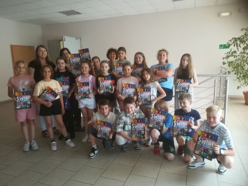Na zakończenie naszej wizyty w księgarni pożegnaliśmy się z jej pracownikami. Nie zabrakło pamiątkowych zdjęć i upominków. Każdy z nas otrzymał książkę pt. „Świat bez tajemnic”.