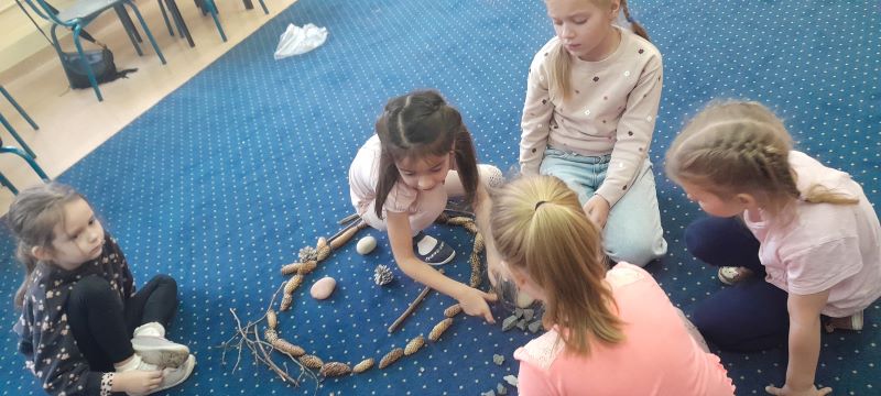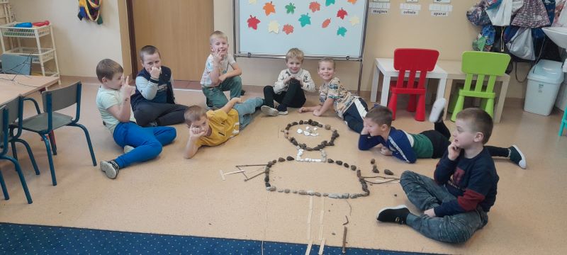Zadanie nr 5 pt.: „E – Eko-logopedia”. Dzieci z przyniesionych wcześniej ekologicznych materiałów tworzyły buźki.