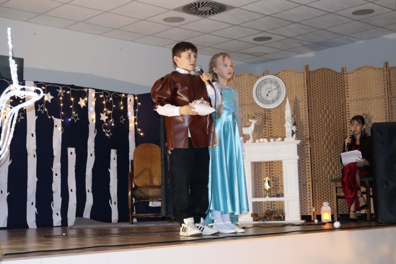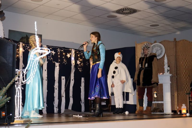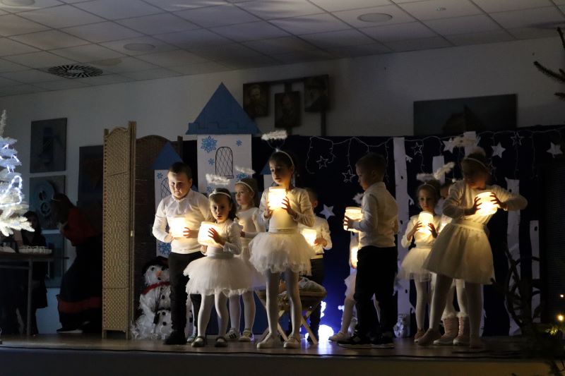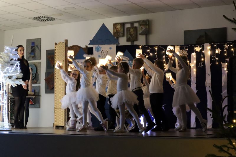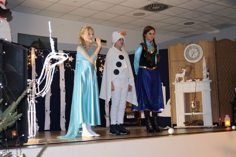 W nastrój zbliżających się świąt Bożego Narodzenia wprowadziły nas występy przedszkolaków, które zaśpiewały piosenkę „Pani Zima” oraz wykonały przepiękny układ taneczny do utworu „Noel”. Ten świąteczny czas umilił nam również nasz absolwent – Piotr Pudys, który grą na trąbce wykonał kilka kolęd. Tegoroczne „Święta z kulturą” uświetnił występ naszych uczniów, którzy wystawili spektakl pt.: „W krainie lodu”. Został on przygotowany przez koło teatralne pod kierunkiem pani Anety Wiei i przy pomocy pani Grażyny Gąbki. Śledząc losy Elsy i Anny można było wprowadzić zgromadzonych na sali w świat najważniejszych dla człowieka wartości w życiu, takich jak: miłość, przyjaźń, dobro i życzliwość. Puentą tegoż przedstawienia były słowa Olafa, który powiedział: Tylko wielka miłość może rozpuścić lód w sercu.