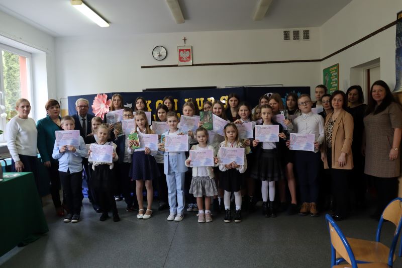 Wyniki konkursu ogłosiła pani Arleta Zadka. Wspólnie z Wójtem Gminy Sośnie – panem Stanisławem Budzikiem oraz Dyrektor Szkoły Podstawowej im. Orła Białego w Granowcu – panią Angeliką Kałka uroczyście wręczyła zwycięzcom w każdej kategorii wiekowej nagrody książkowe. Wszyscy uczestnicy konkursu otrzymali pamiątkowe dyplomy. Nie zabrakło braw, gratulacji, podziękowań dla uczniów i nauczycieli, pamiątkowych zdjęć oraz życzeń – kolejnych sukcesów.