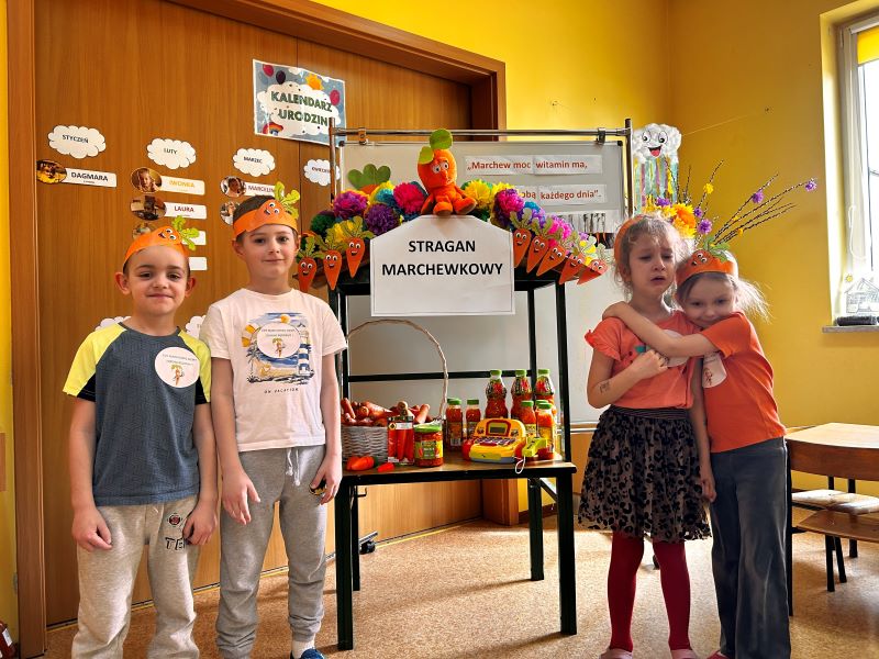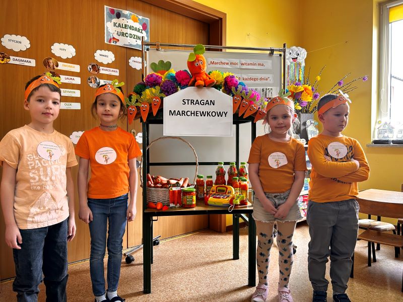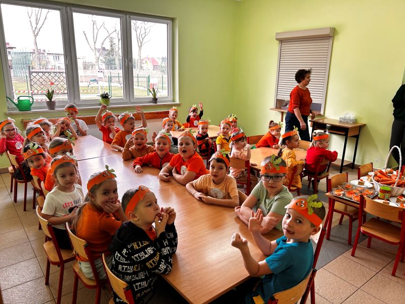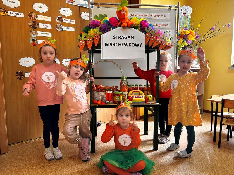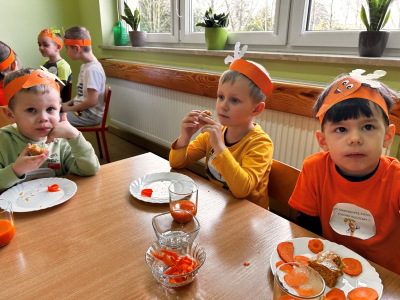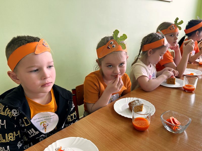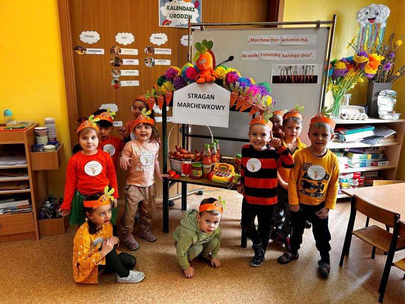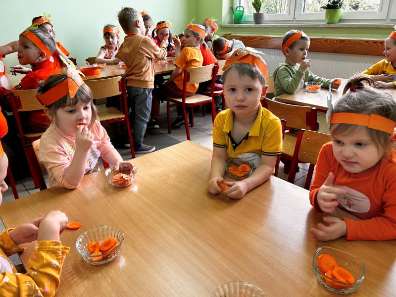 Wszyscy ubrani byliśmy na pomarańczowo, a na głowach wychowanków widniały marchewkowe opaski. Każde dziecko, wchodzące do sali, wkładało przyniesioną marchewkę do specjalnego koszyka mieszczącego się na warzywnym straganie. Po zapoznaniu się z właściwościami odżywczymi marchewki odbyła się jej degustacja: chrupanie surowego warzywka, picie soku , objadanie się ciastem marchewkowym. Śmiechu i zabawy było co niemiara - ale o to właśnie chodziło, żeby ten dzień był wyjątkowy inny od wszystkich - marchewkowy - zakręcony. Po takiej dawce witamin, śmiechu i zabawy na pewno wszystkie przedszkolaki będą zdrowe, piękne i uśmiechnięte.